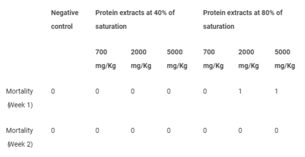 Table 7: Mouse mortality number after administration of undenatured bean protein extracts.